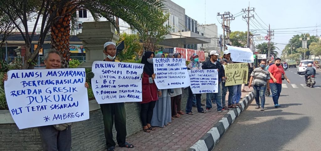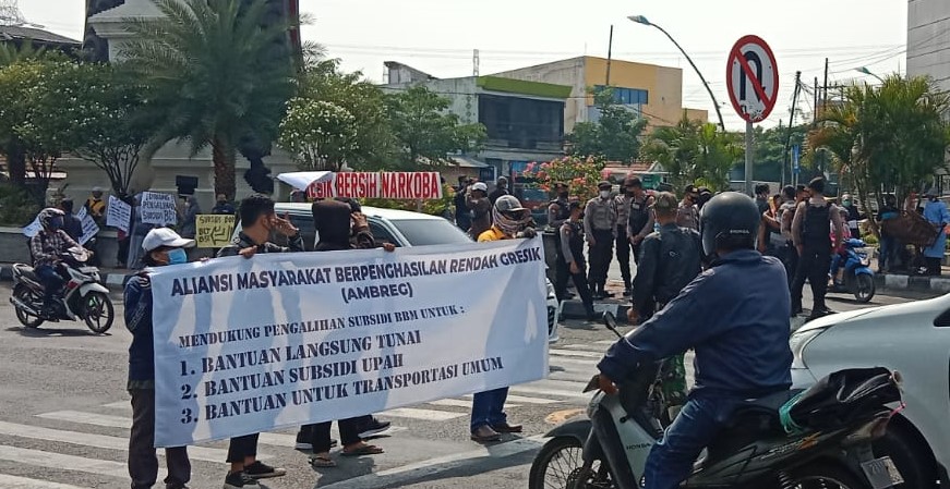 GRESIK (RadarJatim.id) — Sekitar 100 warga yang tergabung dalam Aliansi masyarakat berpenghasilan rendah Gresik (Ambreg) menggelar aksi damai di perempatan Sentolang, Gresik, Sabtu (3/9/2022). Mereka menuntut pemerintah agar bersikap adil dan menyalurkan bantuan subsidi bahan bakar minyak (BBM) tepat sasaran.