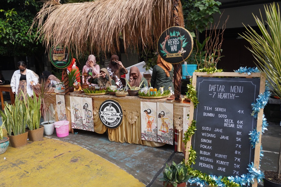 Sejak masuk pintu gerbang, pengunjung disambut dengan pagar bambu beratap ilalang. Di lapangan, tampak sejumlah stan dengan bangunan mirip angkringan. Ada sepuluh stan mengelilingi lapangan. Stan-stan tersebut digunakan untuk pameran bazar. Para siswa kelas VII memajang produk olahan hasil empon-empon.