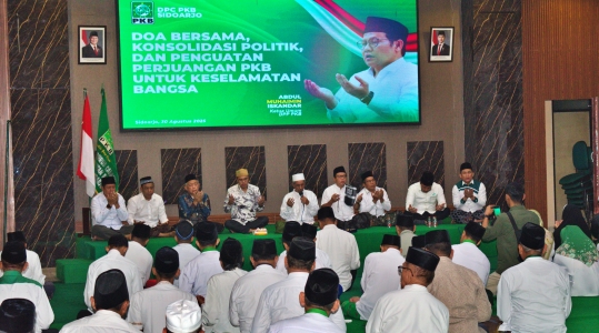 SIDOARJO (RadarJatim.id) – Dewan Pimpinan Cabang Partai Kebangkitan Bangsa (DPC PKB) Sidoarjo menggelar shalat ghaib dan istigghotsah bersama untuk mendo’akan Almarhum Affan Kurniawan yang meninggal dunia terlindas Kendaraan Perintis (Rantis) milik Kepolisian Republik Indonesia (Polri) ditengah aksi unjuk rasa didepan gedung Dewan Perwakilan Rakyat Republik Indonesia (DPR RI) beberapa waktu yang lalu.