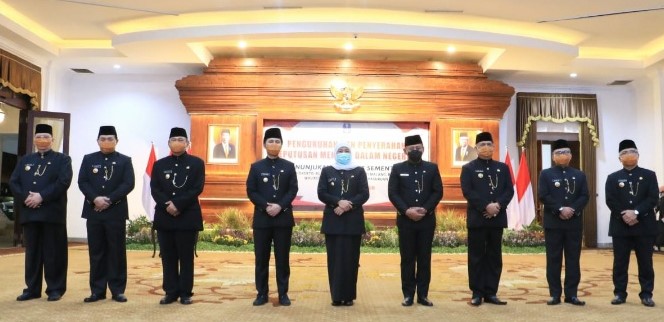 SURABAYA (radarjatim.id) – Gubernur Jawa Timur Khofifah Indar Parawangsa melantik enam orang pejabat eselon II di Pemprov Jatim menjadi penjabat kepala daerah. Pelantikan enam penjabat (Pj) bupati dan wali kota ini, karena terdapat enam pejabat yang cuti untuk mengikuti Pilkada serentak. Pelantikan digelar di Gedung Negara Grahadi Surabaya, Jumat (25/9/2020) malam.