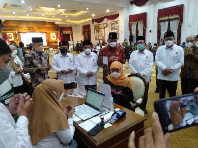 SURABAYA (RadarJatim.id) — Gubernur Jawa Timur Khofifah Indar Parawansa menyerahkan zakat kepada Badan Amil Zakat Nasional (Baznas) Provinsi Jawa Timur. Langkah Khofifah ini kemudian diikuti pejabat lainnya di jajaran Pemprov Jatim, di Gedung Negara Grahadi, Jumat (15/4/2022).
