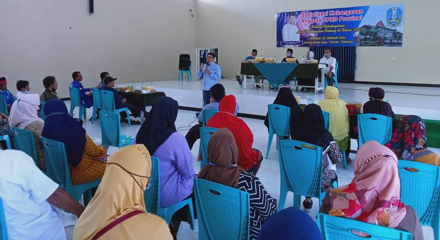 SIDOARJO (RadarJatim.id) Anggota DPRD Provinsi Jawa Timur H Khulaim Junaidi,S,P,MM memberikan wawasan kebangsaan warga Taman. Dikemas dalam ajang Sosialisasi Kebangsaan Anggota DPRD Provinsi Jawa Timur, kegiatan tersebut digelar di Gedung Serba Guna Podo Joyo,  Jl. Nyi Cempo Barat RT 16 RW 05, Kedung Turi, Kecamatan Taman, Kabuapten Sidoarjo, Jawa Timur.