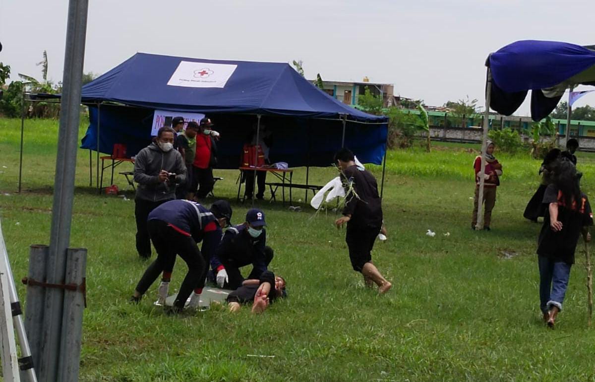 Para peserta sangat antusias dalam mengikuti simulasi penanganan krisis kesehatan pasca bencana alam di lapangan Desa Ngaban-Kecamatan Tanggulangin.