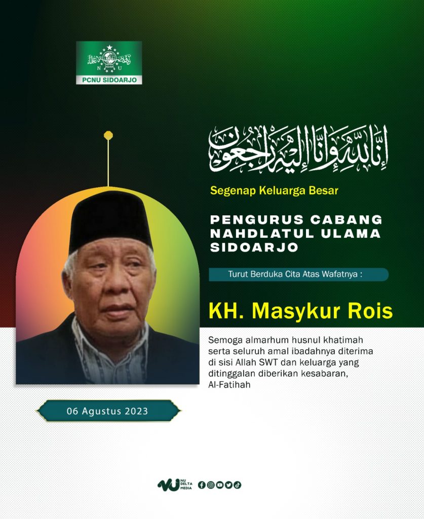 SIDOARJO (RadarJatim.id) Keluarga besar Pimpinan Cabang Nahdlatul Ulama (NU) Kabupaten Sidoarjo berduka. Salah satu pengurus PC NU Sidoarjo, KH Masykur Rois berpulang ke rahmatullah.