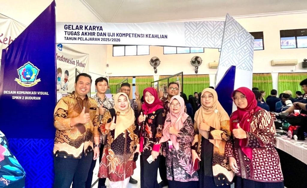SIDOARJO (RadarJatim.id) — Ratusan siswa SMK Negeri 2 Buduran, khususnya siswa kelas XII Jurusan DKV (Desain Kuminasi Visual) sebanyak 111 stand telah menggelar hasil karyanya, berupa produk yang sangat variatif dan inovatif, serta menarik perhatian para pengunjung, pada (29/1/2026) di Aula SMK Negeri 2 Buduran.