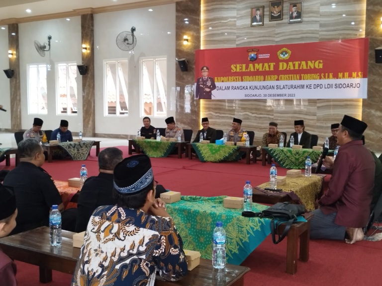 SIDOARJO (RadarJatim.id) — Kapolresta Sidoarjo, AKBP Christian Tobing, S.IK, M.H., M.Si melakukan silaturahim ke DPD LDII (Lembaga Dakwah Islam Indonesia) Kabupaten Sidoarjo di Aula Pondok Pesantren Al Barokah Desa Sruni, Kecamatan Gedangan, Kabupaten Sidoarjo, Sabtu (30/12/2023). Dalam kunjungan tersebut Kapolresta didampingi Kapolsek Gedangan, Kompol Rochsulullah.