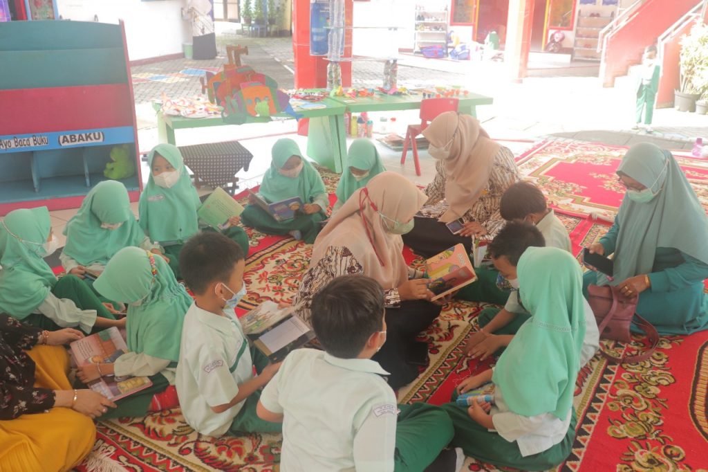 Selanjutnya orang tua dan siswa dipersilahkan memilih buku yang disediakan oleh sekolah dan perputakaan keliling daerah yang akan dibaca bersama. Salah satu siswa B-3, Hafis dan Ayahnya mempresentasikan buku yang telah dibaca berjudul “Kura-Kura dan Kelinci”, Hafis menggunakan topi, boneka kelinci serta kura-kura, Hafis dan Ayahnya sangat antusias dan ekspresif saat menceritakan isi buku tersebut. Aisyah siswa A-1 dan Bundanya juga mempresentasikan buku yang telah dibaca berjudul “Bermain Asyik di Play Ground”.