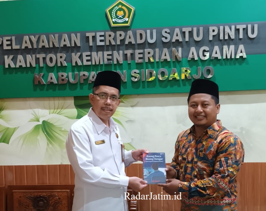 SIDOARJO (RadarJatim.id) — Kepala Kemenag Kabupaten Sidoarjo Dr. H. Muh. Arwani, M.Ag M.H.I memberikan apresiasi yang setinggi-tingginya kepada salah satu guru MI Ma’arif Pagerwojo Buduran Sidoarjo, Muhammad Dzikrudin Djazuli, S.Pd karena telah berhasil meluncurkan buku ‘Ruang Baca Ruang Dengar’ hasil karyanya sendiri.