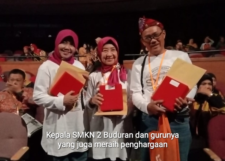 Kepala SMKN 2 Buduran, Sidoarjo Mariya Ernawati bersama 4 gurunya (Devy, Elviana, Kasma dan Syamsuddin) mendapatkan penghargaan sebagai Penulis Syair Dunia yang tersusun dalam sebuah antologi) serta mendapat apresiasi Video Syair Terbaik, Kasma).