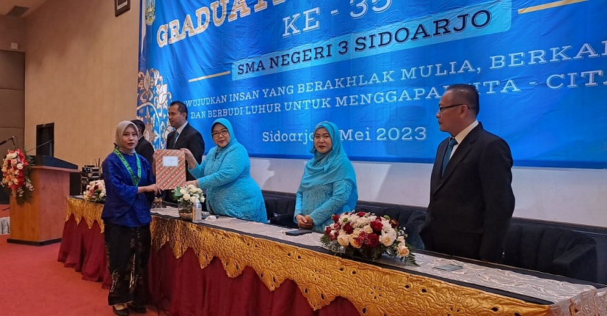 SIDOARJO (Radarjatim.id) – Prosesi Wisuda ke 35 siswa kelas XII SMA Negeri 3 Sidoarjo telah dilakukan dengan mengambil tema ‘Wujudkan Insan Berakhlak Mulia, Berkarakter dan Berbudi Luhur Untuk Menggapai Cita-cita’ diikuti sebanyak 432 peserta didik dengan tiga bidang peminatan, MIPA, IPS dan Bahasa, pada Rabu (3/5/2023) pagi.