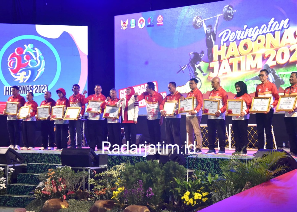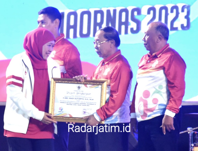 SIDOARJO (RadarJatim.id) — Ketua Umum KORMI (Komite Olahraga Masyarakat Indonesia) Kabupaten Sidoarjo MG. Hadi Sutjipto, SH MM meraih penghargaan dari Gubernur Jawa Timur Khofifah Indar Parawansa sebagai Pembina Olahraga dari Unsur Perorangan, pada peringatan Hari Olahraga Nasional (Haornas) Jatim 2023, Jumat (22/9/2023) malam.