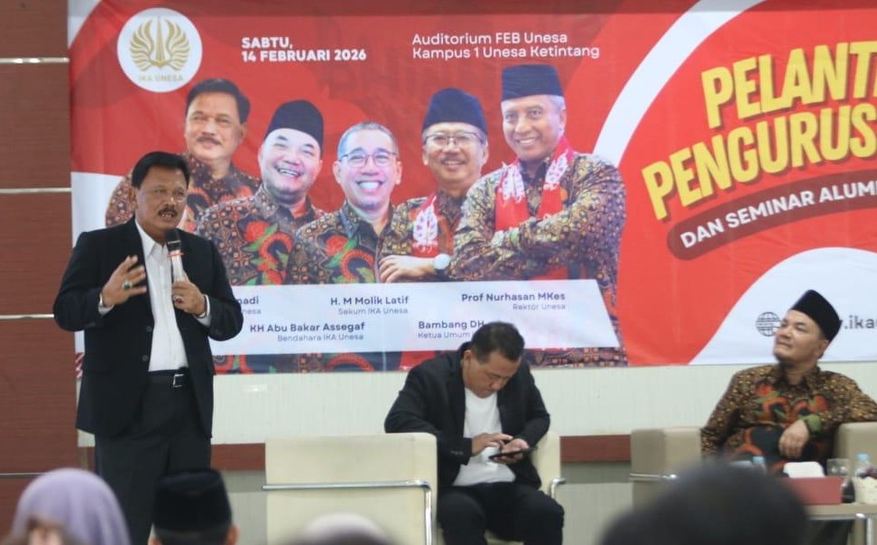 SURABAYA (RadarJatim.id) — Pengurus Pusat Ikatan Keluarga Alumni Universitas Negeri Surabaya (PP IKA Unesa) melantik Pengurus Cabang IKA Unesa periode 2026–2031 di Auditorium Fakultas Ekonomi dan Bisnis, Kampus I Ketintang, Unesa, Sabtu (14/2/2026). Kegiatan ini sekaligus dirangkai dengan talk show bertajuk “Ekspetasi dan Realitas Dunia Kerja.