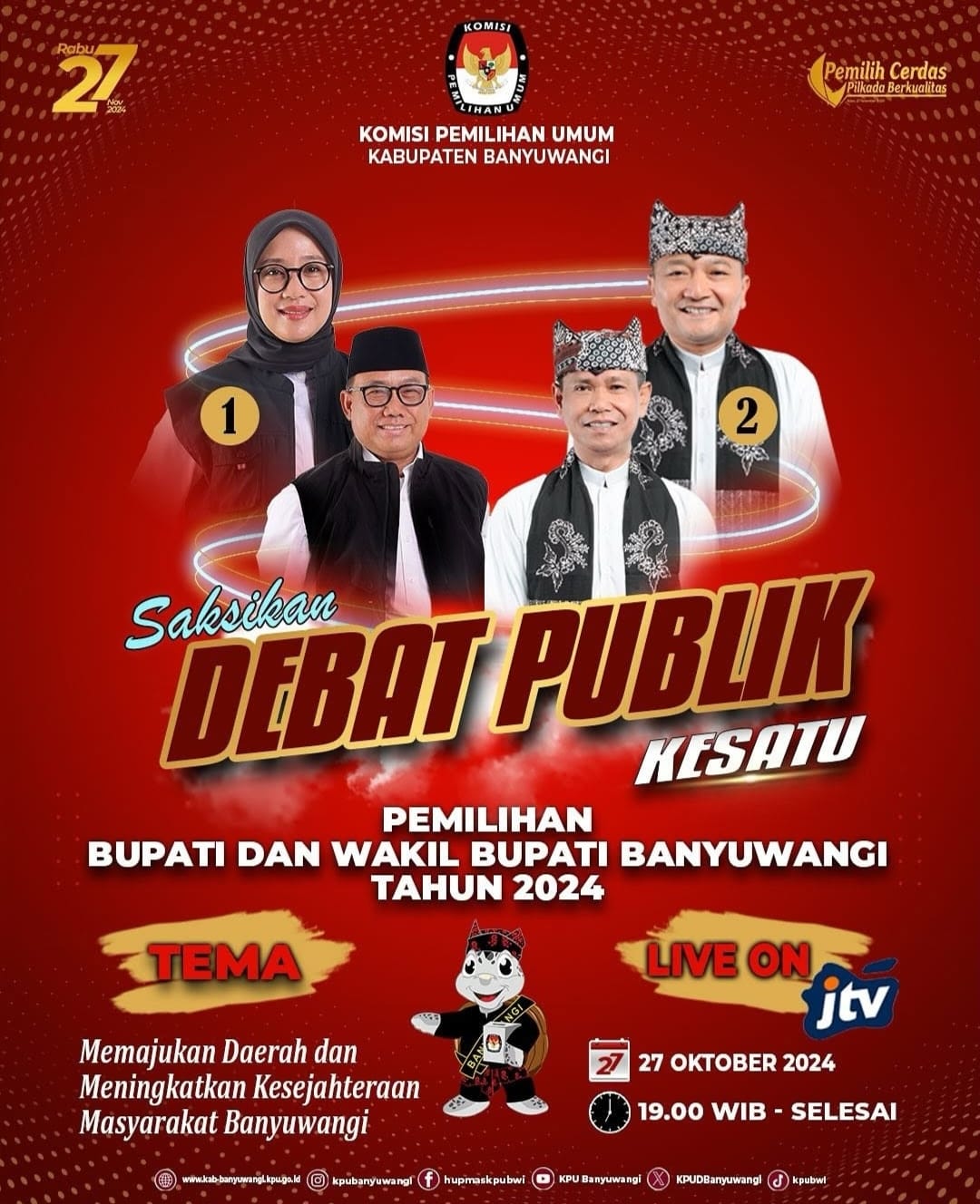 Masyakarat Banyuwangi pun diimbau untuk menyaksikan sesi debat pertama ini untuk mendengarkan program kerja dua pasangan calon Cabup-Cawabup Banyuwangi yang bertarung di Pilkada Serentak 2024.