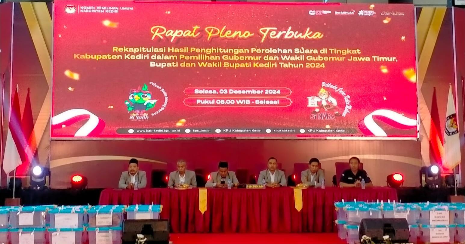 KEDIRI (RadarJatim.id) — Komisi Pemilihan Umum (KPU) Kabupaten Kediri, Jawa Timur menggelar rapat pleno terbuka rekapitulasi hasil penghitungan perolehan di tingkat Kabupaten Kediri dalam pemilihan Gubernur dan Wakil Gubernur, Bupati dan Wakil Bupati Kediri tahun 2024.