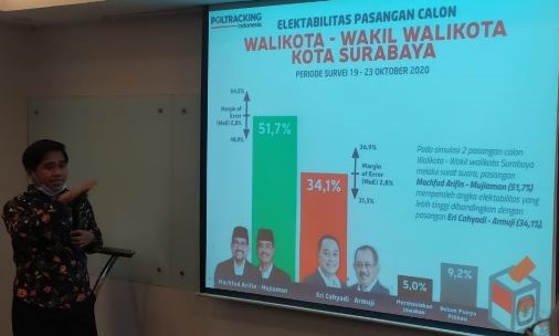 Sebagai informasi, sudah ada dua lembaga survei independen yang mempublikasikan hasil surveinya terkait Pilwali Surabaya 2020. Pertama, Lembaga Populi Center merilis hasil poling elektabilitas Paslon Cawali dan cawawali pada Jumat (30/10/2020) lalu. Kemudian, pada Senin (2/11/2020) lembaga survei independen Poltracking Indonesia merilis data hasil survei mereka. (Phaksy/Red)