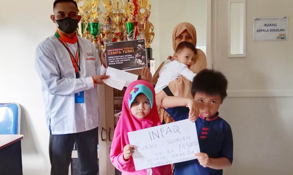 “ Alhamdulillah mitra sinergi BMH bekerjasama dengan mahasiswa Hhidayatullah di Turkey terus melakukan evakuasi dan menyalurkan donasi serta bantuanya dari para donator. Di Sidoarjo ada sekolah KB-TK Islam Cahaya Ananda Sidoarjo yang telah menyalurkan amanah donasi untuk gempa Turkey melalui Laznas BMH Gerai Sidoarjo,” kata Manager Operasional Lembaga Amil Zakat Nasional (Laznas) Baitul Mall Hidayatullah (BMH) Gerai Sidoarjo, S. Abd Karim, S.E.I, Senin (27/02/2023).