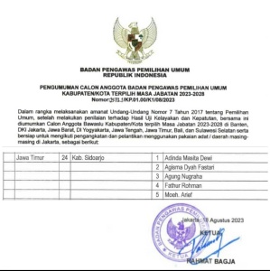 SIDOARJO (RadarJatim.id) – Badan Pengawas Pengawas Pemilu Republik Indonesia (Bawaslu RI) secara resmi sudah mengumumkan calon anggota Bawaslu Kabupaten/Kota terpilih untuk masa jabatan 2023-2028.