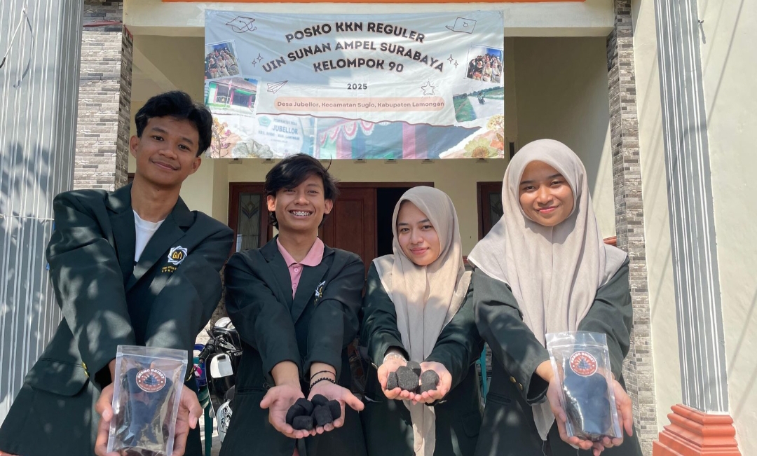 SURABAYA (Radarjatim.id) – Mahasiswa Kuliah Kerja Nyata (KKN) Universitas Islam Negeri Sunan Ampel (UINSA) Surabaya, Kelompok 90. Hadirnya membawa sesuatu yang tak biasa: briket. Sekam padi dulunya hanya dianggap sisa panen yang tak berguna. Bukan sekadar praktik teknologi, tapi sebuah gagasan yang tumbuh dari kenyataan di Desa Jubellor, Lamongan.