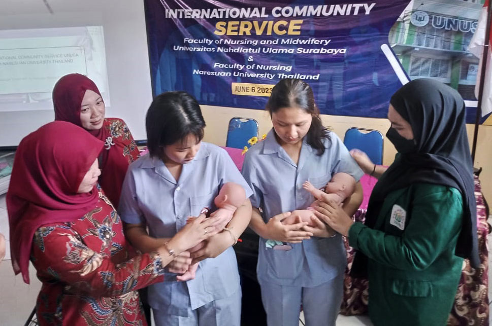 SURABAYA (Radarjatim.id) – Sebanyak 13 mahasiswa dari Fakultas Keperawatan Universitas Naresuan Thailand belajar pijat laktasi di Kampung ASI Wonokromo Surabaya. Kegiatan ini dilaksanakan bersama mahasiswa dan dosen Fakultas Keperawatan dan Kebidanan Universitas Nahdlatul Ulama Surabaya (FKK Unusa) serta kader Kampung ASI binaan Unusa, sebagai wujud program international community service.