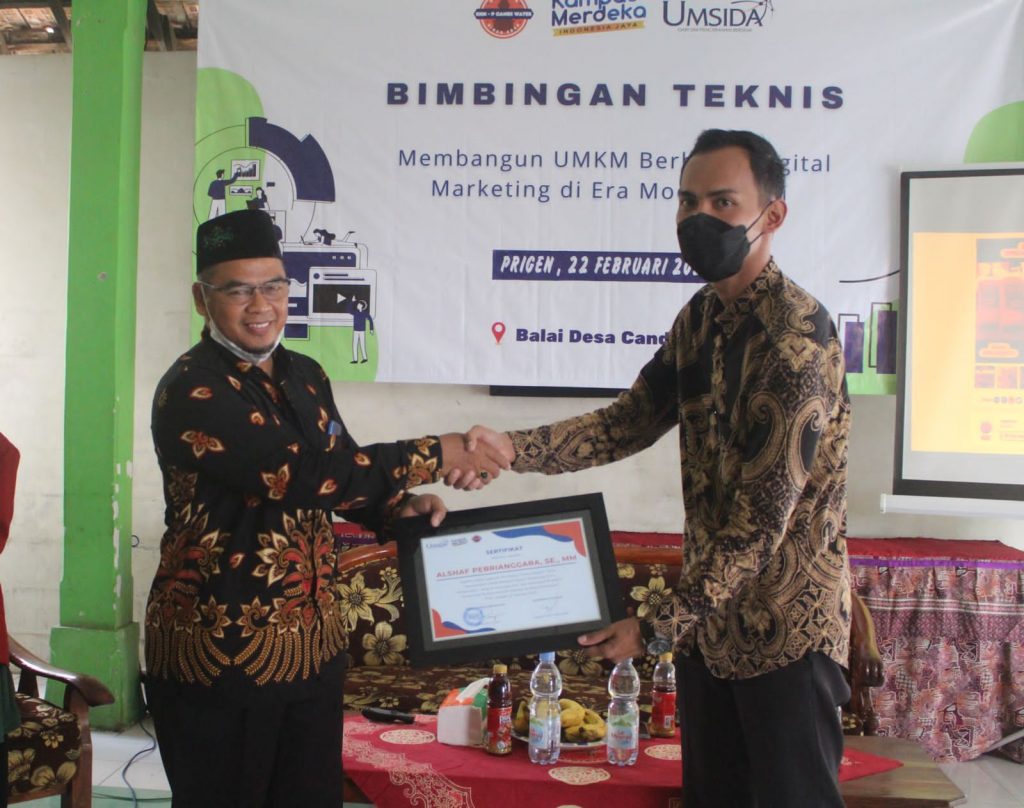 SIDOARJO (Radar Jatim.id) Kelompok 59 Kuliah Kerja Nyata (KKN) Pencerahan Universitas Muhammadiyah Sidoarjo (Umsida) lakukan Bimbingan Teknik (Bimtek) berbasis digital kepada Usaha Mikro Kecil Menengah (UMKM) Desa Candi Wates. (22/2/2022).