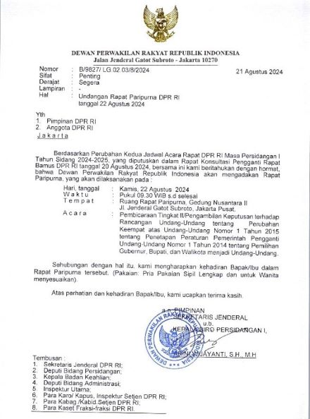 Namun, berdasarkan surat undangan yang beredar ke publik, Rabu (21/8/2024), rapat paripurna digelar pada Kamis (22/8/2024) di ruang rapat paripurna Gedung Nusantara II, pukul 09.30 WIB.