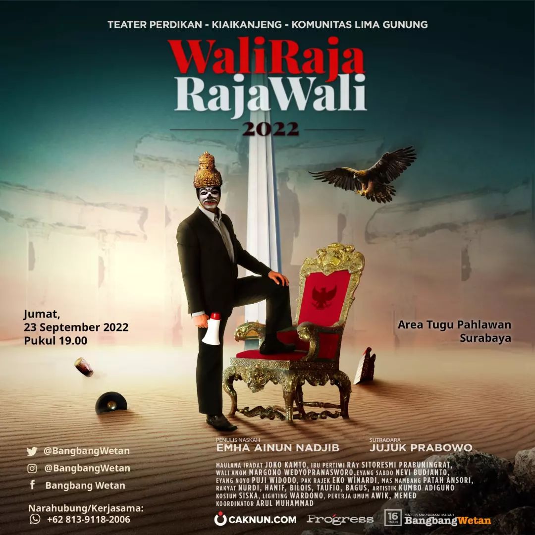 “Ketika Walikota Surabaya Eri Cahyadi mendapatkan informasi Bangbang Wetan akan menjadi tuan rumah pementasan teater WaliRaja RajaWali dan mengambil tempat di Tugu Pahlawan, kontan Walikota Surabaya tersebut merestui dan menggratiskan biaya sewa tempat di Tugu Pahlawan tersebut. Pak Walikota sendiri sudah lama ingin sowan dan Sinau Bareng dengan Mbah Nun. Karenanya, begitu mendengar rencana pementasan ini Pak Walikota langsung antusias, menyanggupi hadir, mendukung pementasan teater WaliRaja RajaWali ini,” demikian mengutip redaksi caknun.com.