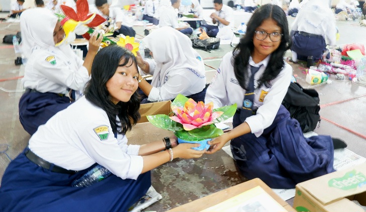 Yakni dari botol atau galon air kemasan, yang dikreasikan oleh anak-anak, sehingga yang awalnya itu adalah limbah anorganik bisa menjadi produk yang bernilai jual tinggi.