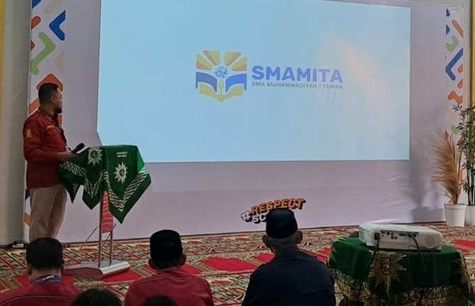 Direktur SMA Muhammadiyah 1 Taman saat melaunching logo baru 'SMAMITA RESPECT SCHOOL'