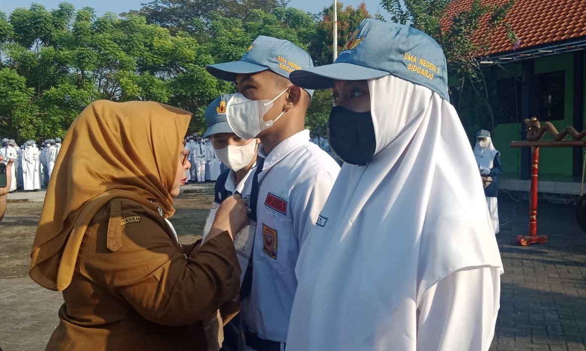Kepala SMAN 3 Sidoarjo menyematkan tanda peserta MPLS