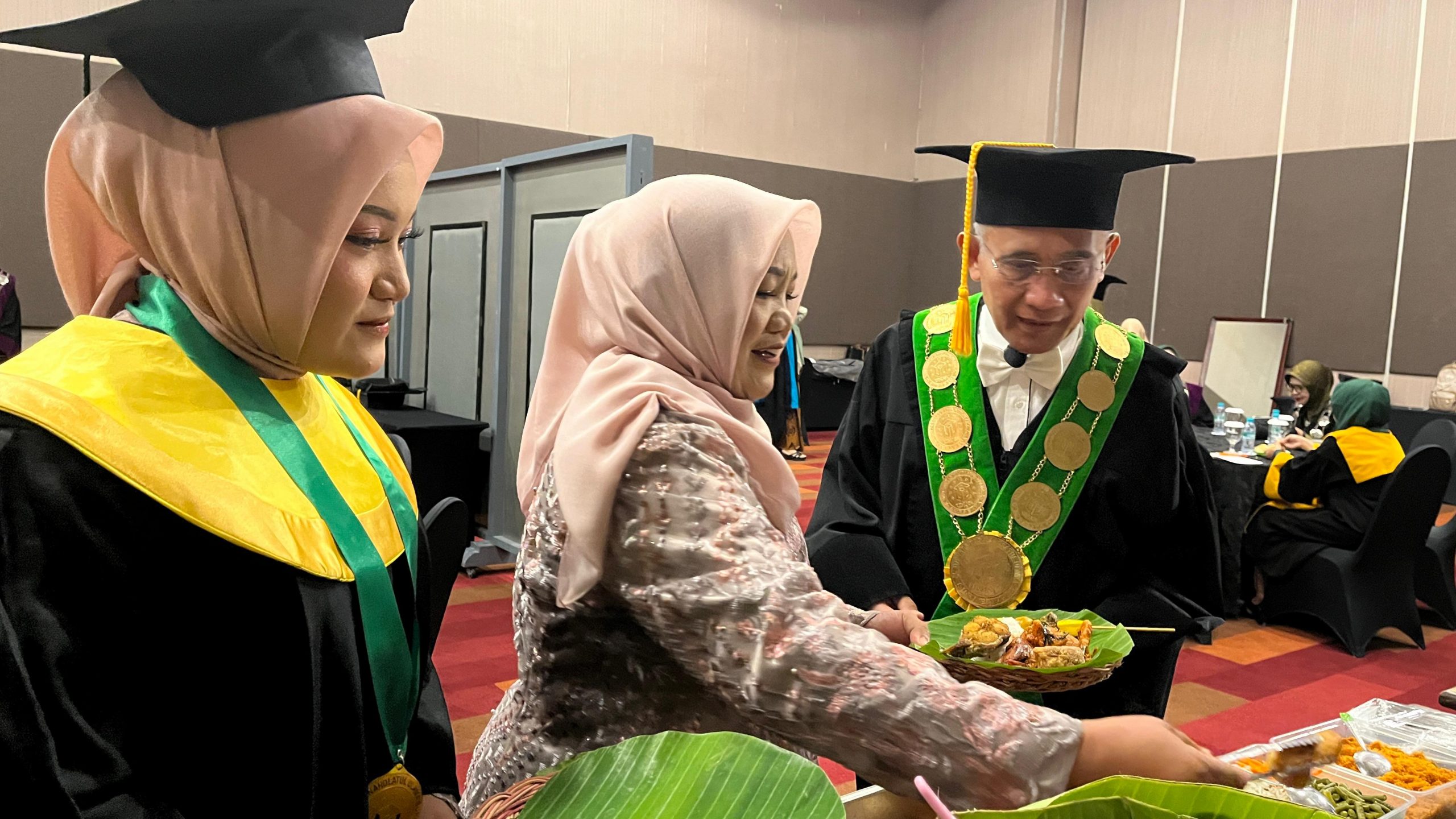 SURABAYA (RadarJatim.id) – Ada pemandangan menarik sebelum acara wisuda di Universitas Nahdlatul Ulama Surabaya (Unusa) yang digelar di Dyandra Convention Hall, Kamis (26/9) pagi. Seorang wisudawan penerima Program Kartu Indonesia Pintar Kuliah (KIPK), yang orang tuanya berprofesi sebagai pedagang makanan di Lamongan, membagikan nasi boran, nasi campur khas Lamongan, kepada Rektor Unusa Prof Dr Ir Achmad Jazdie., M.Eng beserta jajarannya dan panitia penyelenggara wisuda.