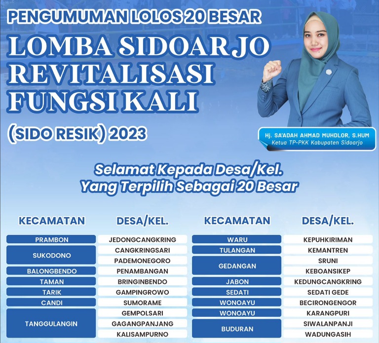 SIDOARJO (RadarJatim.id) — Ketua TP. PKK Kabupaten Sidoarjo, Hj. Sa’adah Ahmad Muhdlor mengumumkan 20 besar pemenang lomba “Sidoarjo Revitalisasi Fungsi Kali (Sidoresik) Tahun 2023”.
