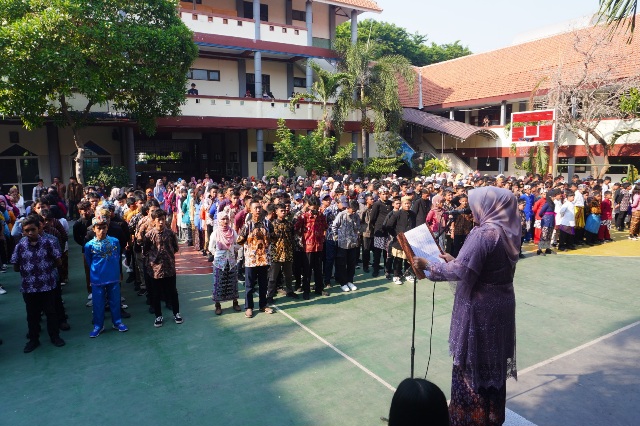 Para siswa serta guru dan tenaga kependidikan (GTK) SMPN 3 Sidoarjo memakai baju daerah, dari Sabang sampai Merauke. Hadir sebagai pembina upacara kepala SMPN 3 Sidoarjo Lilik Sulistyowati SPd MPd. Dalam amanatnya, Bu Lilis, sapaannya, menyampaikan pesan dari Menteri Pemuda dan Olahraga (Menpora) Republik Indonesia Dito Ariotedjo.