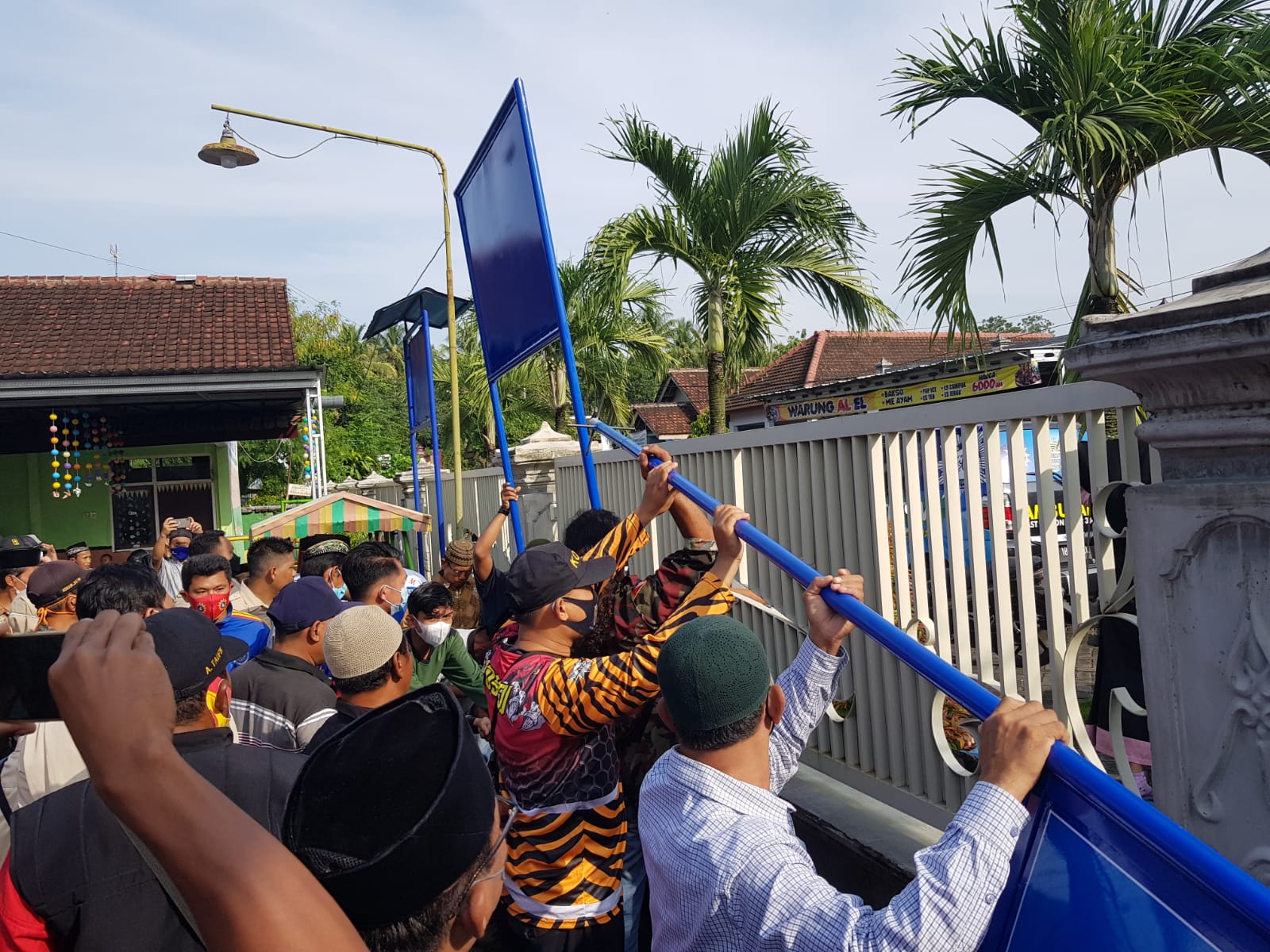 Para kader Muhammadiyah bersama warga dusun Krajan bergotong-royong memasang kembali papan nama Muhammadiyah di depan Masjid Al Hidayah.