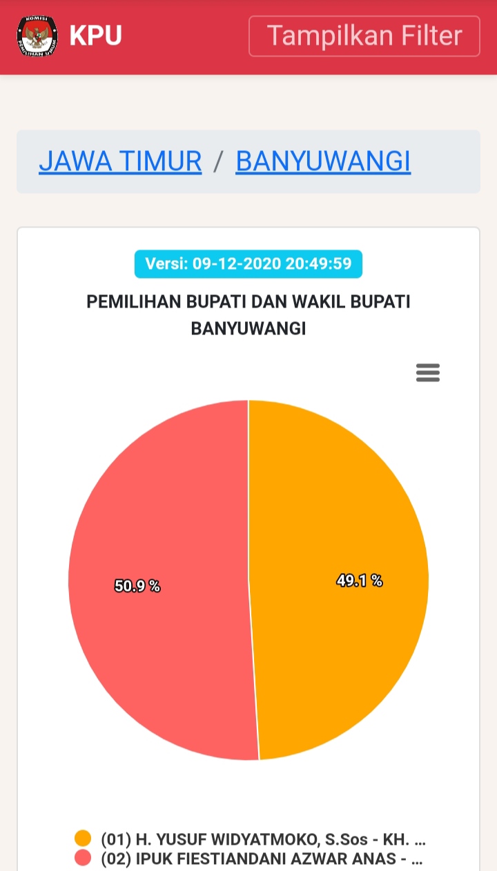 Berdasarkan hasilk penghitungan KPU yang dirilis di WEB-nya https://pilkada2020.kpu.go.id/#/pkwkk/tungsura/3510, selisih perolehan suara sangat tipi. Mas Yusuf-Gus Riza 49,1% dan Ipuk Sugirah 50,9%. Prosentase tersebut dsihitung dari 160 TPS yang masuk, dari total TPS berjumlah 3745 TPS, atau baru masuk 4,27%,