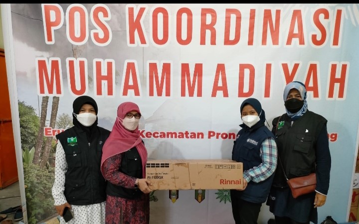 Bantuan berupa 5 tabung elpiji isi 12 kg, 10 galon mineral, kompor gas, piring, gelas, dispenser, pencuci piring, juga makanan sarden, diterima langsung oleh Indra Feri, Koordinator Relawan MDMC Pronojiwo, Lumajang.