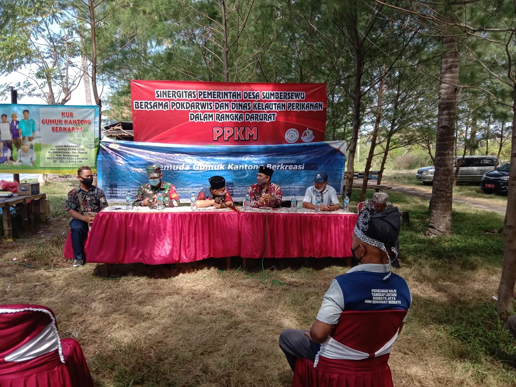 BANYUWANGI – Puluhan warga Desa Sumbersewu, Kecamatan Muncar berkumpul dipinggir pantai pesisir Gumuk Kantong. Mereka berkumpul dalam rangka acara gelar rapat Pemberlakuan Pembatasan Kegiatan Masyarakat (PPKM) Darurat.