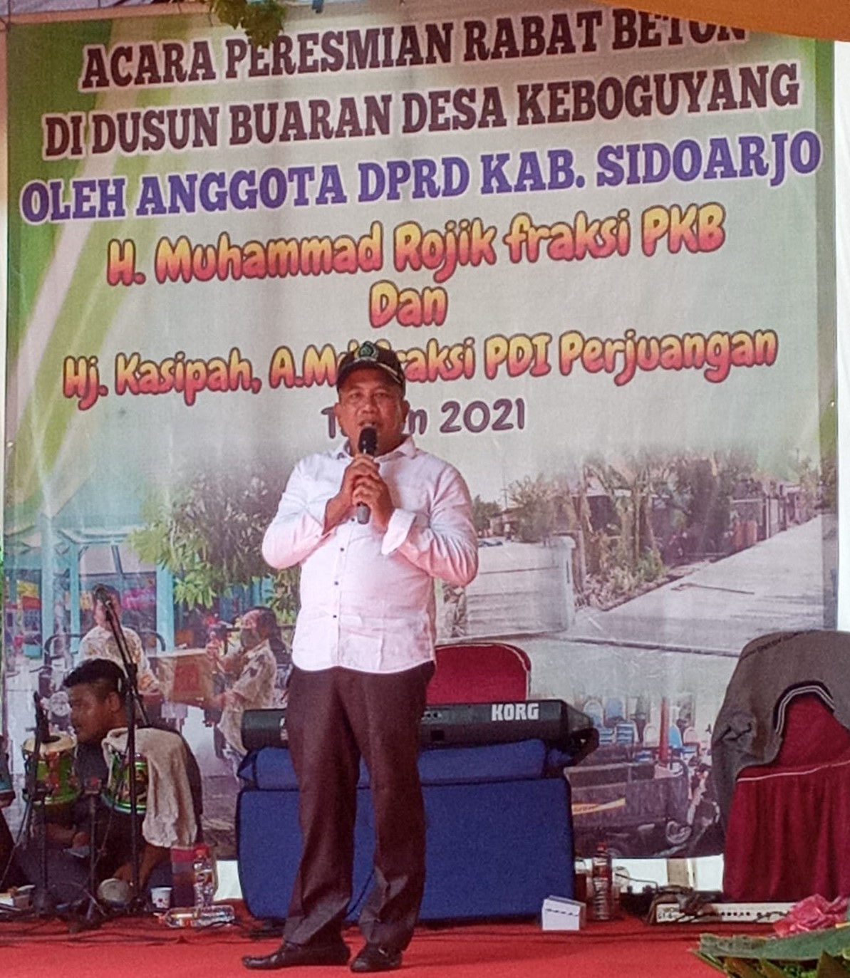 Hal itu disampaikan oleh HM. Rojik anggota Dewan Perwakilan Rakyat Daerah (DPRD) Kabupaten Sidoarjo saat meresmikan pembangunan jalan lingkungan di Dusun Buaran, Desa Keboguyang-Kecamatan Jabon, Jum’at (10/12/2021).