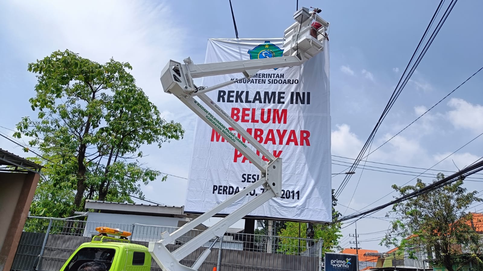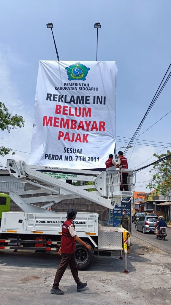 SIDOARJO (Radarjatim.id) Pemerintah Kabupaten Sidoarjo melalui Badan Pelayanan Pajak Daerah (BPPD) Kabupaten Sidoarjo telah melakukan penertiban tiga titik reklame besar yang berada di Kecamatan Sukodono, dikarenakan belum membayar pajak cukup lama, sekitar 2 – 4 tahun dengan kisaran pajaknya Rp 5 juta per tahun.