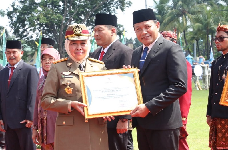SIDOARJO (Radar Jatim.id) — Pemerintah Kabupaten Sidoarjo menerima penghargaan sebagai Pembina K3 Terbaik V Jawa Timur 2023. Prosesi penyerahan penghargaan oleh Gubernur Jawa Timur, Khofifah Indar Parawansa kepada Wakil Bupati Sidoarjo H. Subandi SH, pada upacara Peringatan Bulan Keselamatan dan Kesehatan Kerja (K3) Nasional Tahun 2023 Tingkat Jawa Timur di lapangan bola Prapat Kurung, Perak Timur, Surabaya, Kamis (12/01/23).