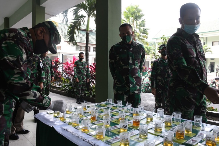 Ratusan prajurit dari beberapa Satuan yang sudah berada di lokasi itupun, diminta untuk segera menyerahkan urine masing-masing. Danrem 083/Baladhika Jaya, Kolonel Inf Irwan Subekti