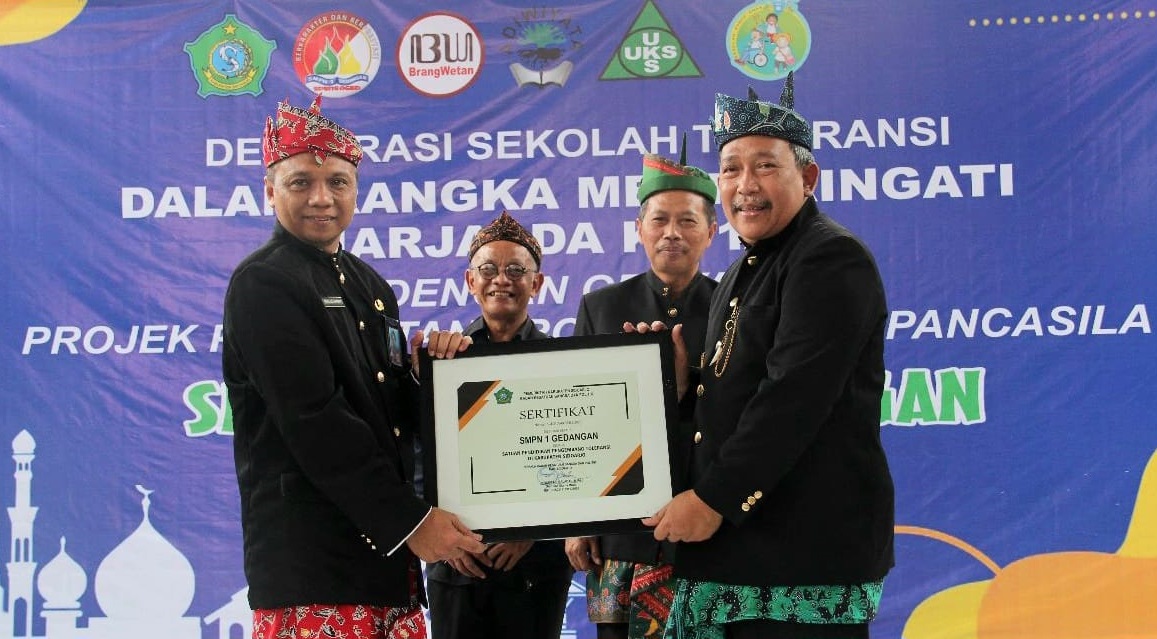 Kepala SMPN 1 Gedangan, Ketua Komunitas BrangWetan, Kepala Dikbud Sidoarjo dan Kepala Bakesbang Sidoarjo bersama-sama menunjukkan SK Sekolah Toleransi