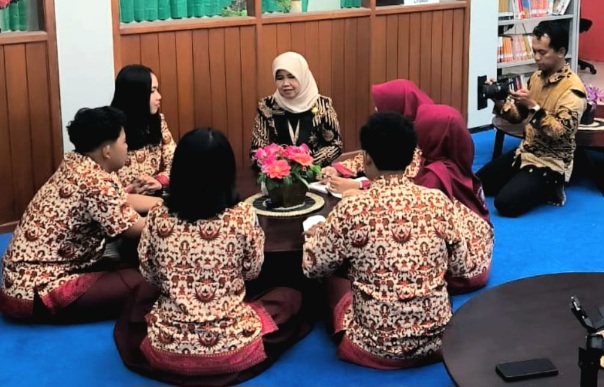 Kepala SMK Negeri 2 Buduran berada di tengah-tengah siswanya yang sedang memakai pakaian adat nusantara, yang menggambarkan moderasi beragama