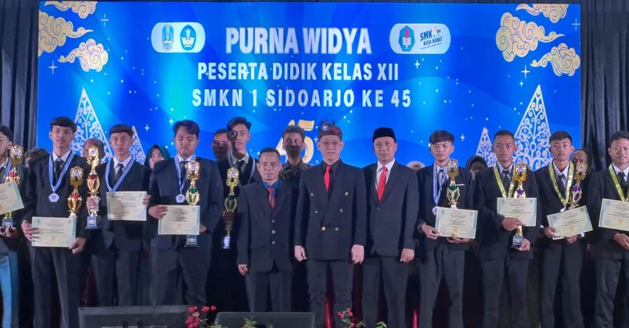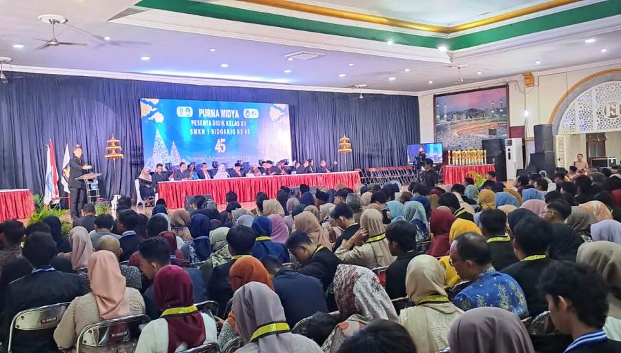 SIDOARJO (RadarJatim.id) — Pelaksanaan Purna Widya ke 45 SMK Negeri 1 Sidoarjo tahun ajaran 2023/2024 suasananya sangat meriah. Gemuruh tempuk tangan para undangan tak henti-hentinya menyemangati dan meramaikan pengumuman prestasi yang diraih oleh para siswanya.