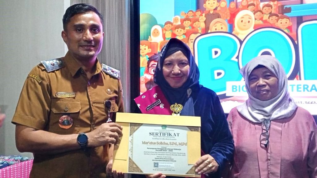 Prosesi penyerahaan penghargaan diberikan langsung oleh Kepala Dinas Perpustakaan dan Kearsipan Sidoarjo Rudi Setiawan, S.SIP M.Si MH dan Anggota Komisi D DPRD Kabupaten Sidoarjo, pada (21/4/2026) di Ruang Bolam Dinas Perpustakaan dan Kearsipan Jl. Jaksa Agung Sidoarjo.