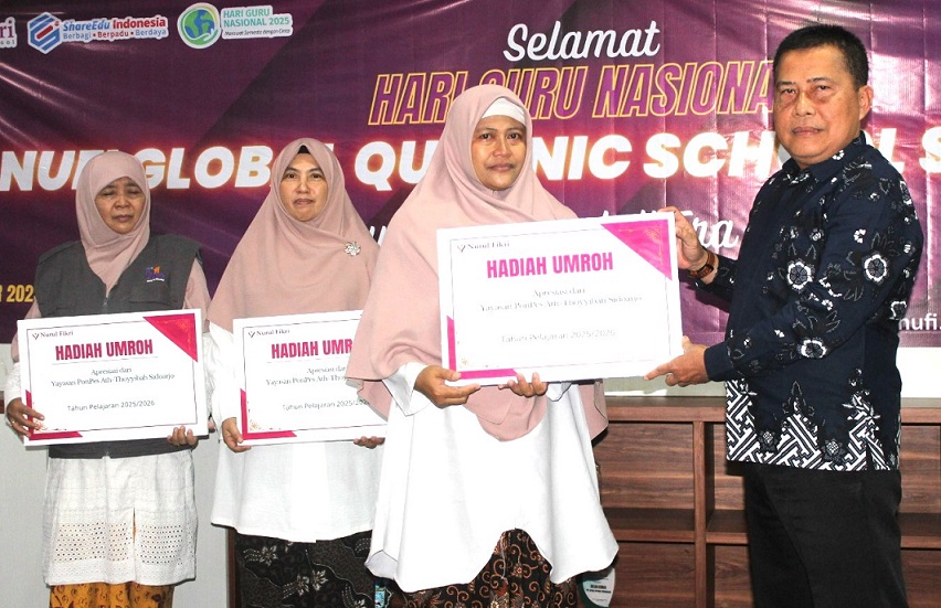 SIDOARJO (RadarJatim.id) – Bertepatan dengan Peringatan HGN (Hari Guru Nasional) 2025, Yayasan Pondhok Pesantren Ath Thoyyibah Sidoarjo yang menaungi lembaga pendidikan Nufi (Nurul Fikri) di Sukodono telah memberikan apresiasi, gurunya, tenaga kependidikan juga kepada pengurus yayasan, berupa hadiah Umroh.
