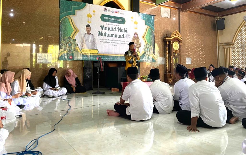 Dalam sambutannya, Kepala SMP Negeri 1 Jabon, Yayuk Dian Mandasari, S.Pd., M.Pd., menuturkan pentingnya meneladani akhlak Rasulullah dalam kehidupan sehari-hari.