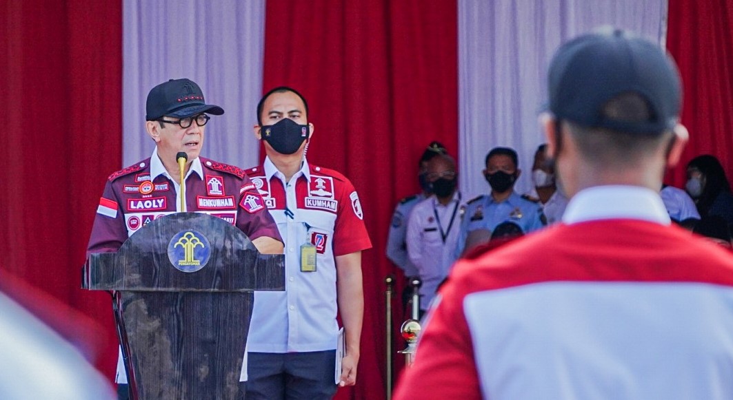 BATAM (RadarJatim.id) — Kementerian Hukum dan HAM RI melangsungkan Apel Nasional Gabungan di Dermaga 99 Harbour Bay, Batam, Rabu (19/1/2022). Apel yang digelar sebagai salah satu rangkaian acara menuju Hari Bhakti Imigrasi Ke-72 itu diikuti oleh 26 instansi eksternal dan dihadiri secara langsung oleh Menteri Hukum dan HAM, Yasonnal H. Laoly serta Wakil Menteri Hukum dan HAM, Edward Omar Sjarief Hiariej.