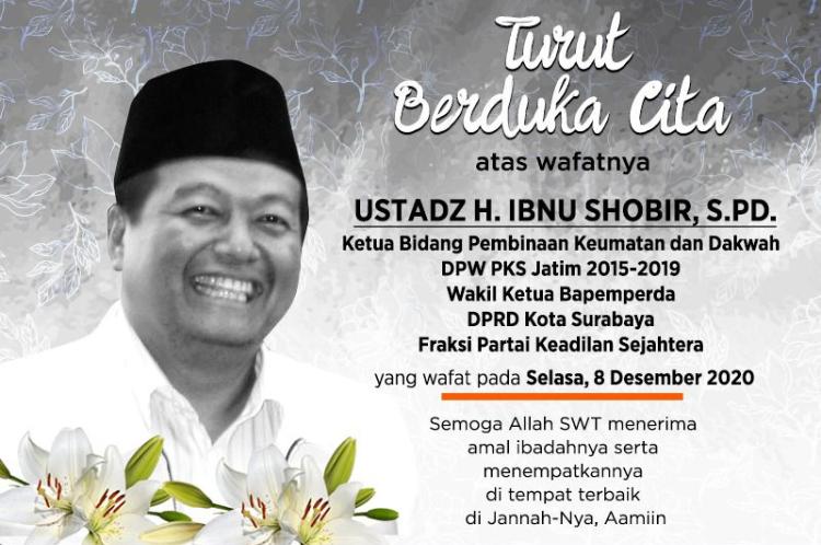 “Inna lillaahi wa inna il aihi roji’un. Telah meninggal dunia pelayan rakyat, pejuang kebaikan, Ust. Ibnu Shobir, anggota DPRD Kota Surabaya, Ketua BPU DPW PKS Jatim 2015 – 2019, pada: