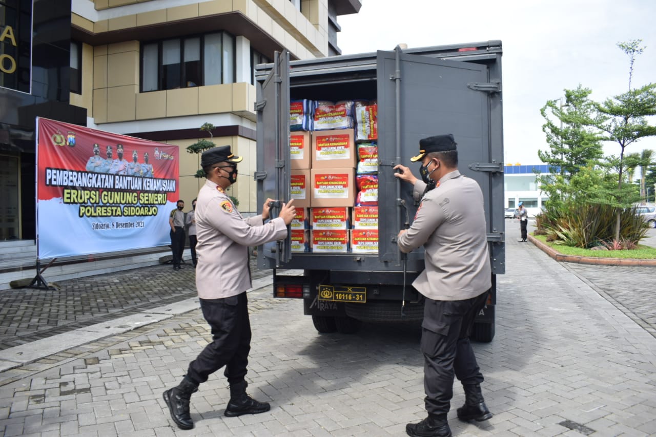 Rabu pagi (8/12/2021), Kapolresta Sidoarjo Kombes. Pol Kusumo Wahyu Bintoro memberangkatkan bantuan sosial yang akan dikirimkan kepada korban bencana erupsi Semeru di Lumajang. Bantuan sosial tersebut berupa 300 paket sembako, air minum, susu, mie instan, kasur, selimut dan pakaian hangat. “Semua lengkap, hari ini kita berangkatkan sebanyak 3 truk,” jelasnya.