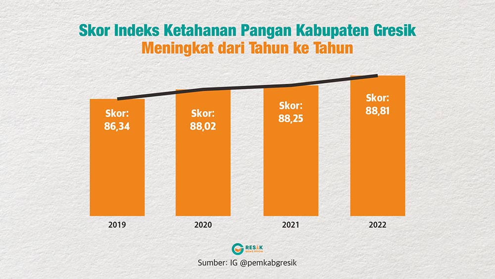 Diskominfo Gresik melalui akun Instagram @pemkabgresik (29/6/2023) merilis data Ketahanan Pangan di Kabupaten Gresik. Disebutkan, Gresik menjadi satu-satunya Kabupaten/Kota di Jawa Timur yang secara konsisten masuk dalam 15 besar daerah dengan ketahanan pangan terbaik di Indonesia.